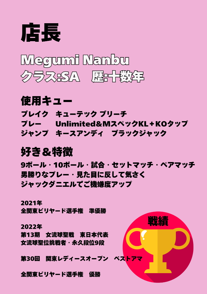 一緒に楽しく真剣にビリヤードしませんか(*・ᴗ・*)و当店では、相撞き可能なスタッフがおりますわいわいプレーもガチンコプレーもOK!試合フォーマットでの事前練習や普段の練習相手として一緒にプレーする事が可能ですご来店の際はお気軽にお声がけ下さい📣★2025.5.10より めぐ店長のレッスンスタートぜひご利用くださーい